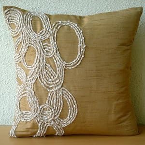 Product Description : Size: 24 x 24 inchJute Rings - Decorative Throw Pillow Cover. This pillow cover is made using Silk Dupioni fabric, hand embroidered with Jute Cord and Pearls. Materials Used - Silk Dupioni, Crystals. The color of the pillow cover is Beige Gold. The back of the pillow is the same Beige Gold Silk Dupioni fabric with a flap covered zipper for clean look and easy removal. This pillow cover is available in Size 16x16 inches, 18x18 inches, 20x20 inches, 22x22 inches and 24x24 inches. Note: This Pillow Cover Design can be Customized in Other Sizes. Send me an email on urvi@thehomecentric.com with your request. Made In India under strict Quality & Environmental standards.